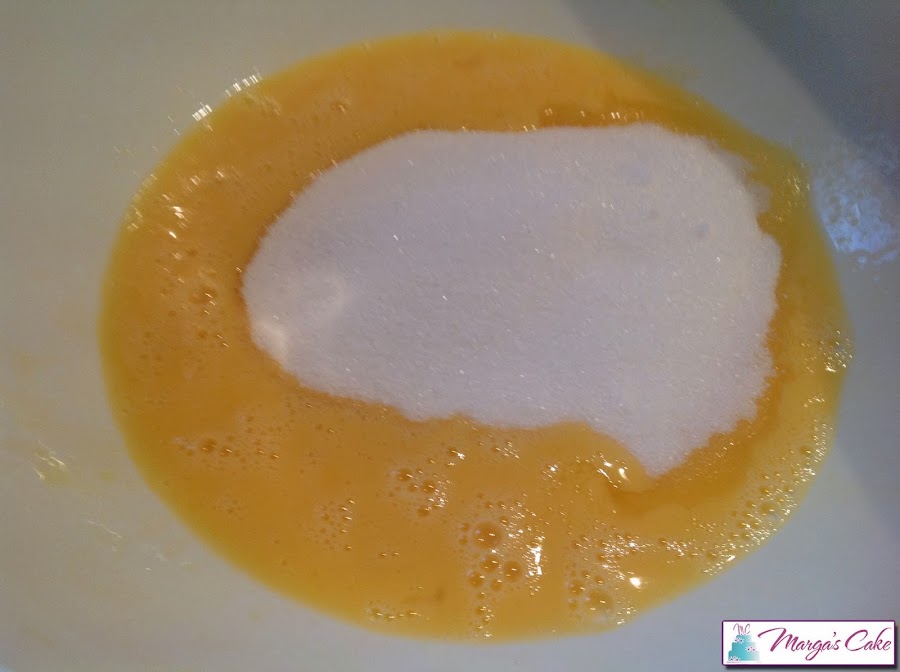 Batimos los huevos y añadimos el azúcar, removemos bien hasta disolver bien los gránulos.