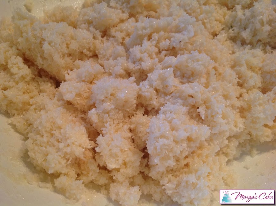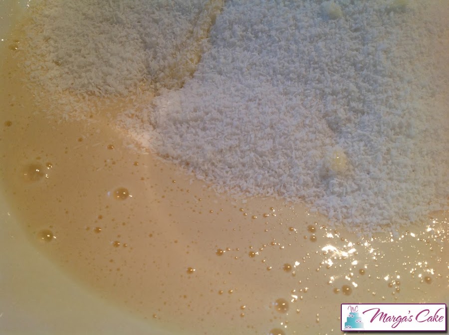 Agregamos el extracto de vainilla, a continuación el coco e integramos bien todo para que el coco se humedezca bien con el huevo.