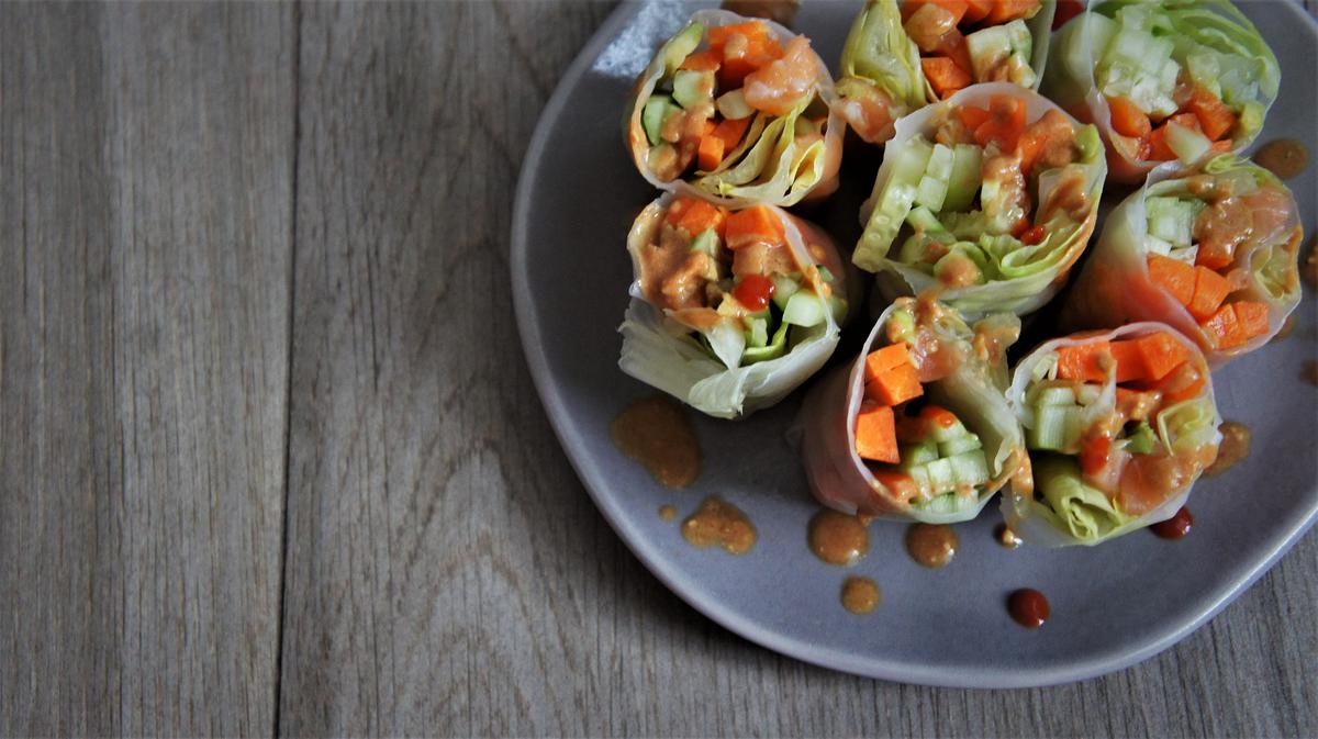 Preparamos una bandeja grande con agua fría y metemos una oblea de papel de arroz unos cinco segundos para que se hidrate. Colocamos la oblea húmeda en un plato y rellenamos en el centro con un poco de cada ingrediente. Cerramos el rollito por un lado, metemos hacia dentro los extremos y seguimos enrollando para que quede bien cerrado. Repetimos esto con todas las obleas.