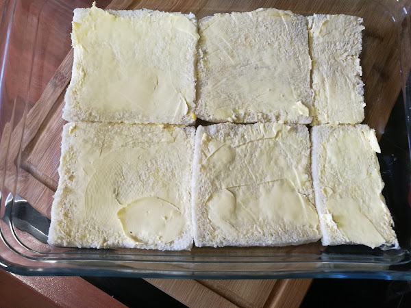 - Untamos por una cara el pan con la mantequilla y cubrimos la bandeja que vayamos a utilizar con él, con la mantequilla hacia arriba