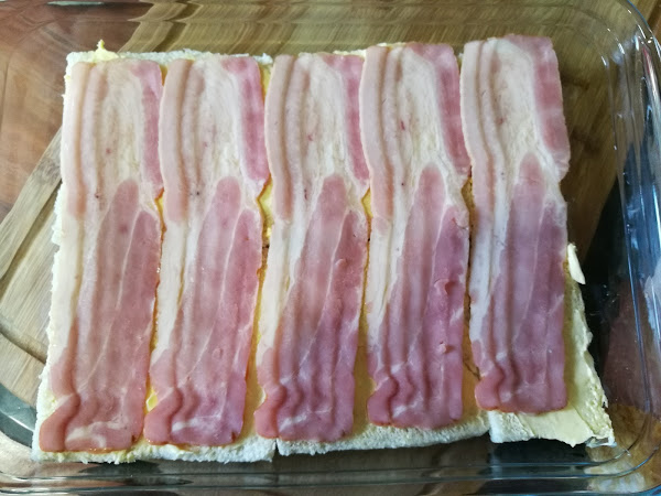 - Cubrimos con las lonchas de bacon, y encia de ellas acomodamos el queso