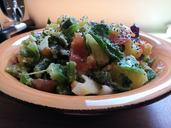 - Ponemos todos los ingredientes de la vinagreta en un vaso y batimos bien. Regamos la ensalada con la vinagreta, y espolvoreamos semillas de chía.
