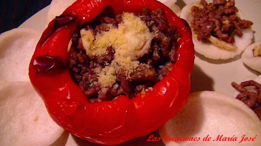 Precalentar el horno a 200º. Limpiar los pimientos, quitar la parte de arriba del pimiento y las semillas. Los metemos en el horno calor arriba y abajo 20 minutos, hasta que veais que estan un poco hecho. Mientras hacemos la carne en una sartén con una cucharada de aceite de oliva y una pizca de sal, cuando este la carne hecha troceamos el huevo cocido y lo mezclamos bien con la carne. Rellenamos los pimientos con la mezcla echamos encima un poco de queso rallado y los metemos otra vez en el horno unos 10 minutos a 200º. Yo los acompañe con pan de gambas.