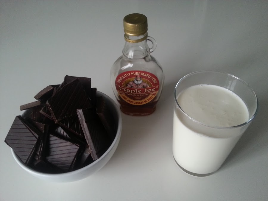 6. - Mientras está en el horno, hacemos la crema de chocolate, poniendo en un cazo la nata (crema de leche) con el chocolate y el sirope y a fuego bajo y removiendo, hasta que esté todo el chocolate derretido. O ponéis todos los ingredientes y los metéis en el micro, de minuto en minuto y removiendo cada vez, hasta que el chocolate esté derretido. Y reservamos.