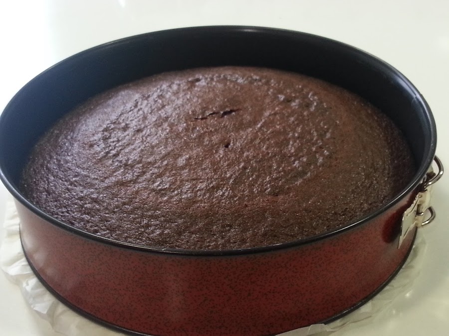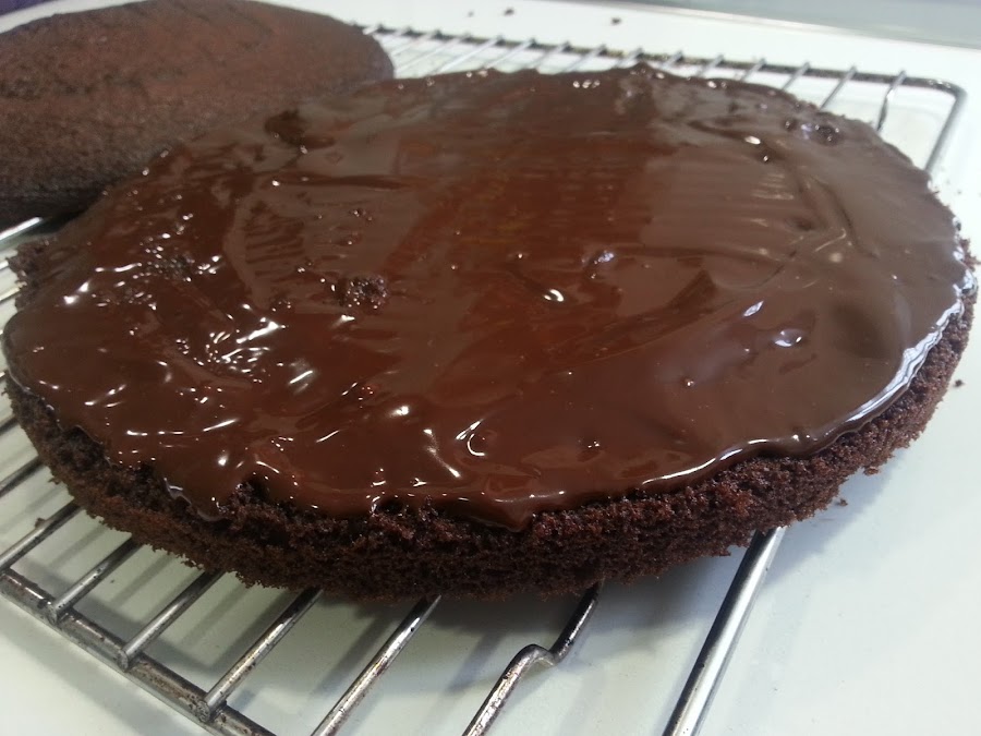 9. - Y por último, vamos echando el chocolate sobre el bizcocho, intentando cubrir toda la superficie, le damos un par de de golpes al plato, para que la cobertura se reparta uniformemente.