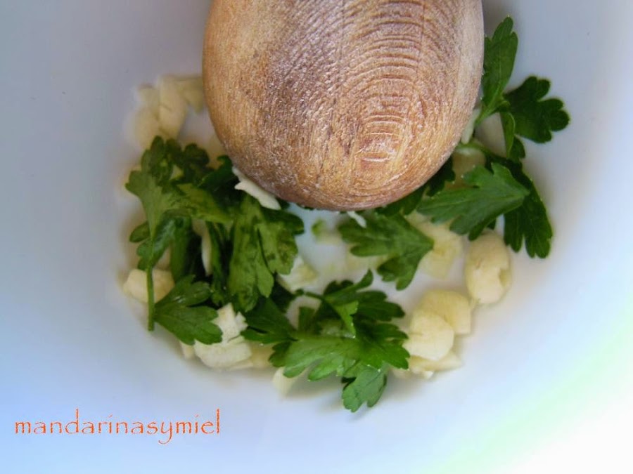 Pica en el mortero los ajos y el perejil.