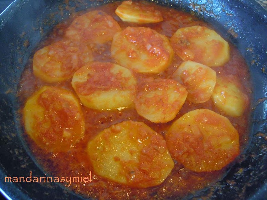En la misma cazuela sofríe la cebolla (si te hace falta ponle más aceite), pon el tomate y fríelo todo a fuego lento. Cuando ya este casi frito pon las patatas y dales unas vueltas, echa el pimentón y mueve, ahora pon el caldo hasta que cubra todas las patatas y un poco más. Cuece todo unos 10 minutos.