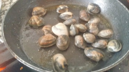 7.- En otra sartén calienta un poco de agua. Cuando empiece a hervir echa las almejas