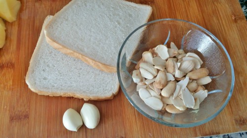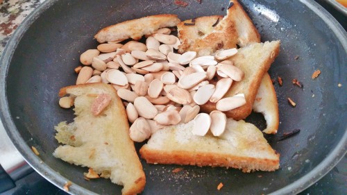 2.- Para la picada pon un poco de aceite en una sartén. Agrega las rebanadas de pan y los dientes de ajo picados. Sofríe los ingredientes