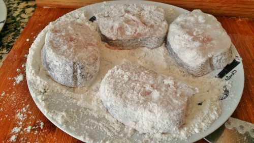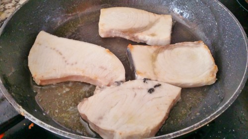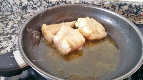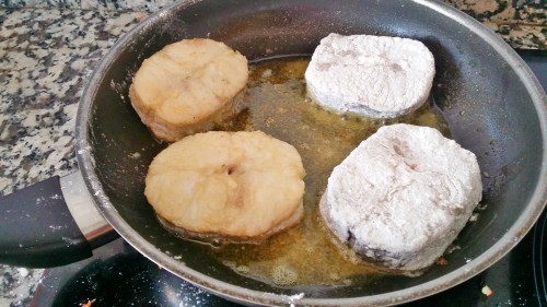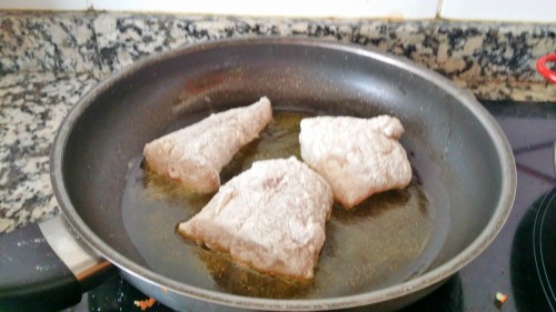 4.- Calienta una sartén con aceite de oliva. Y empezamos con el pescado.