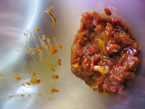 8º " Trituramos la picada,las avellanas con el pan, el perejil, un poco de pimentón rojo, (puede ser picante o dulce, yo particularmente le echo una cucharadita de cada uno) y la carne de las ñoras, reservamos