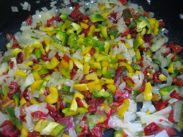 2º " En una sartén colocamos la cebolla una vez cortada en trozos pequeños, y los pimientos, lo sofreímos hasta que coja un poco de color.