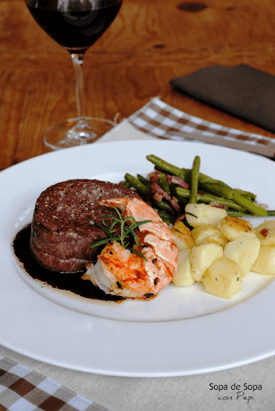 Para servir, poner un fondo de salsa en el plato, colocar el solomillo encima, el gambón apoyado en la carne y una porción de patatas y judías verdes al lado.