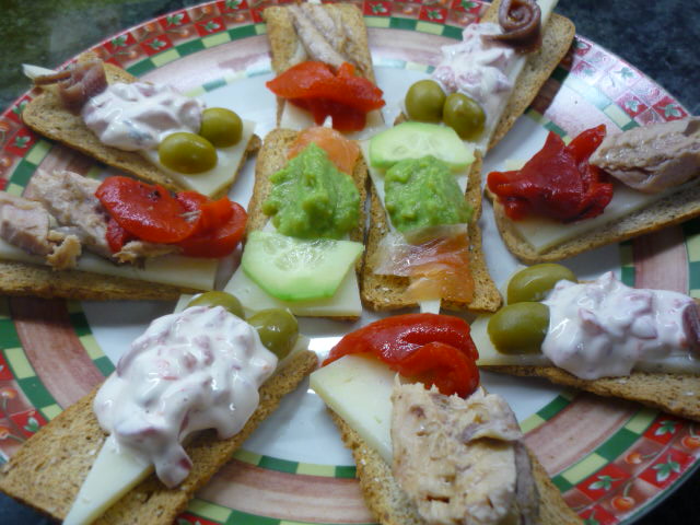 4.- Hacemos los segundos canapés con una cucharada de mayonesa con pimientos, una anchoa y una aceituna abierta en dos.