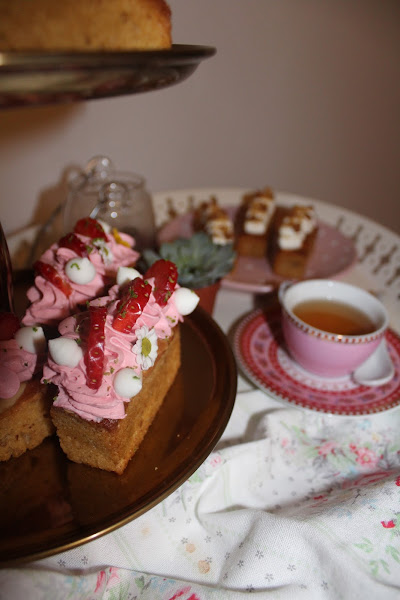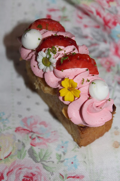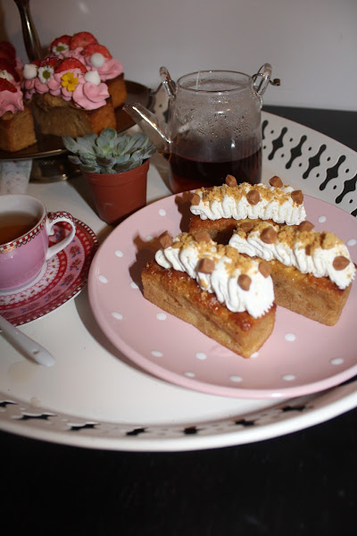 Decoramos a nuestro gusto, en este caso he usado flores frescas comestibles, frutas, merenguitos y para el de manzana, he rallado galleta spéculoos por encima y le he puesto unos cubitos de toffee que he comprado.