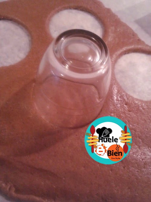 2.- Estiramos la masa con el rodillo sobre papel de horno, o una superficie cubierta por un poco de harina. Cortamos con un molde circular o con un vaso de café pequeño.
