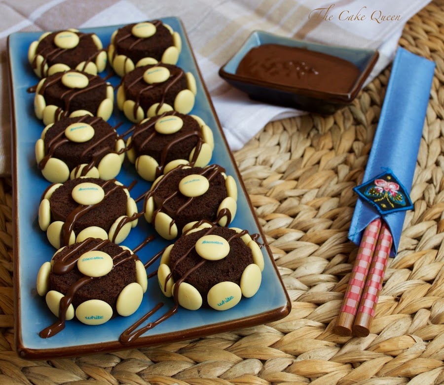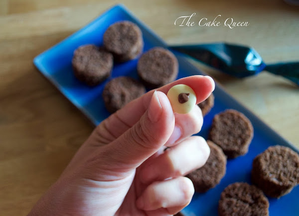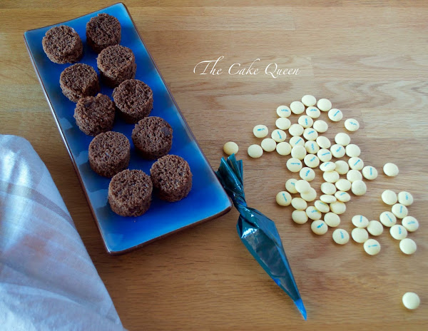 Luego con la ayuda de tu chocolate favorito (yo usé chocolate al 80% derretido en el microondas por tan solo unos segundos) y la de una manga pastelera, pegaremos alrededor de nuestros discos los Lacasitos white, tal como lo puedes apreciar en la foto.