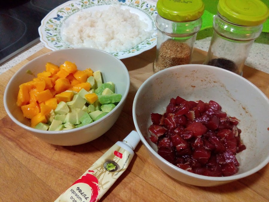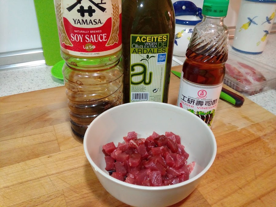 Dos filetes de atún, un mango, un aguacate (ambos en su punto, no demasiado maduros), cuatro cucharadas soperas de salsa de soja, dos cucharadas soperas de aceite de oliva virgen extra, una cucharada mediana de sésamo blanco y una cucharada sopera de sésamo negro, una pizca de sal y pasta de wasabi.