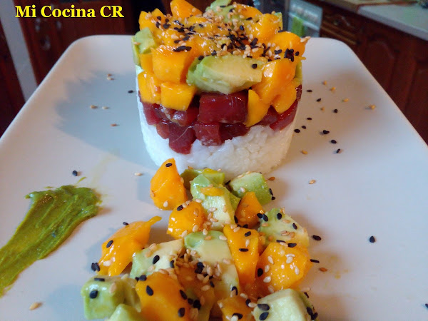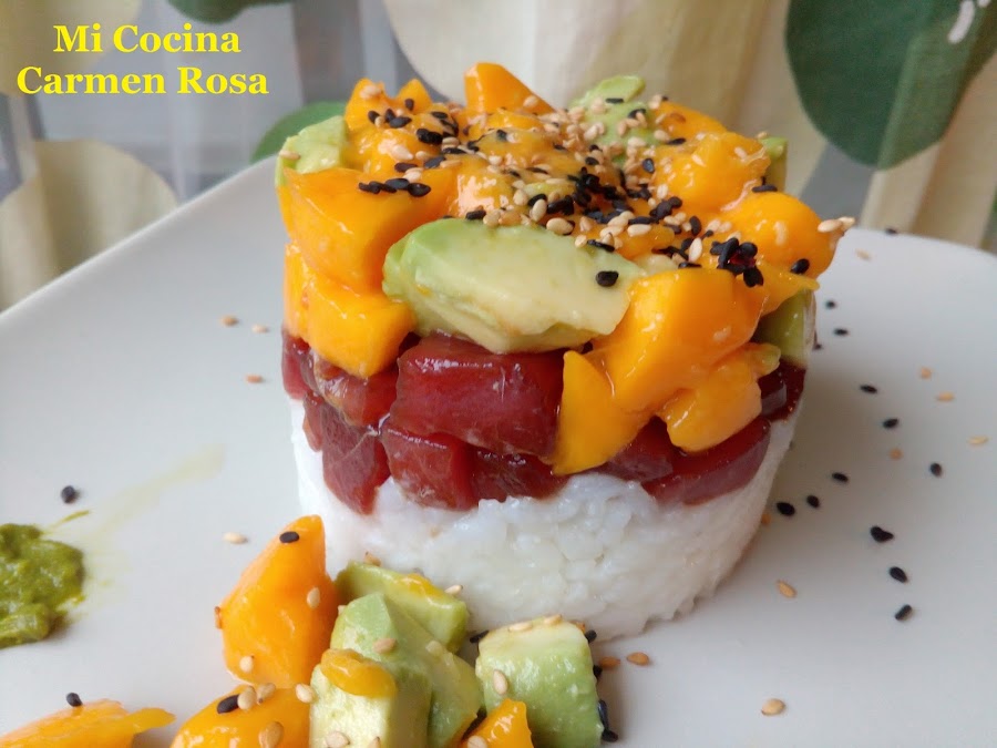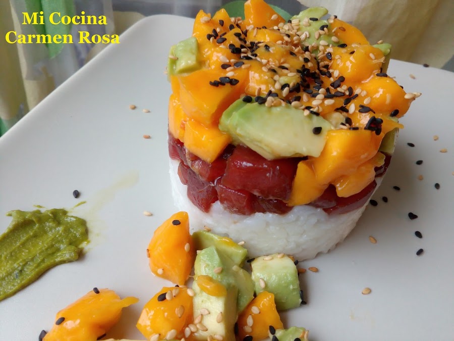 Colocar el molde en el plato, poner una primera capa de arroz, seguidamente incorporar el atún y por último el aguacate junto con el mango mezclado.