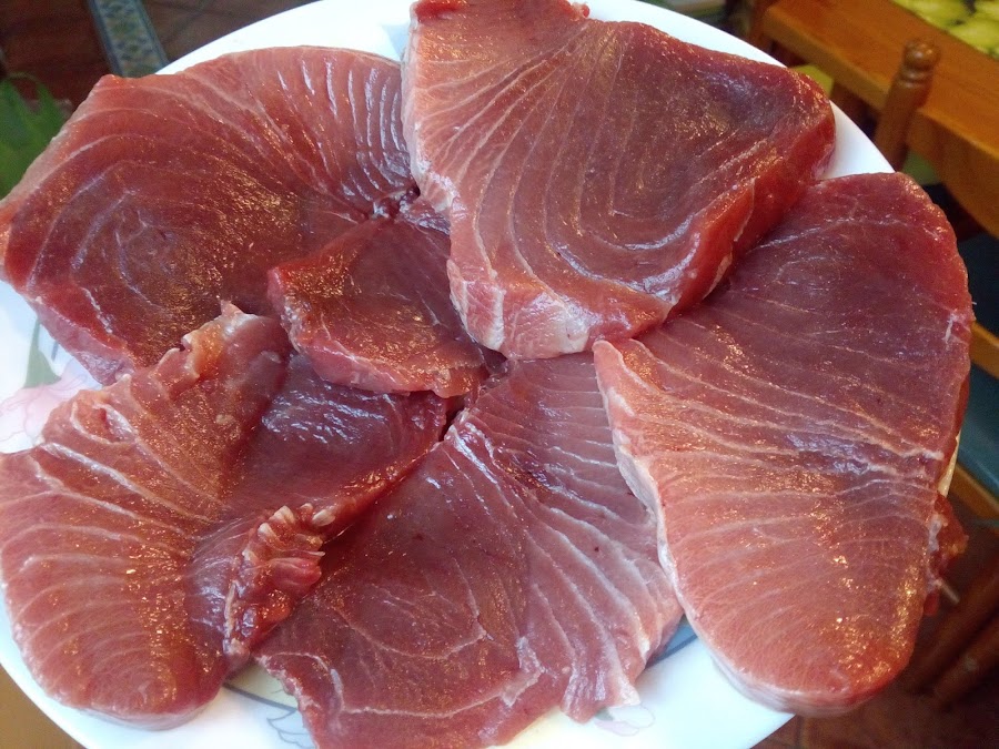 ¿Qué yo no lo iba a hacer? ¡¡ Me faltó tiempo !! Al día siguiente, en el Mercado de Huelin, Salvador (el mejor puesto de pescadería, de atún, pez espada y salmón) ronqueaba un hermosísimo atún, aún estaba con la cabeza cuando le dije que quería un buen trozo, sobre todo para comerlo crudo…..con su gran habilidad, ante el asombro de clientes me despiezó el morrillo del animal,