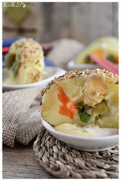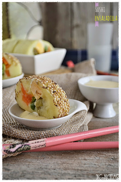 En si la receta es muy sencilla, y el resultado sorprende porque nadie se imagina que en realidad sea una ensaladilla, con esta presentación que simula el típico plato asiático.