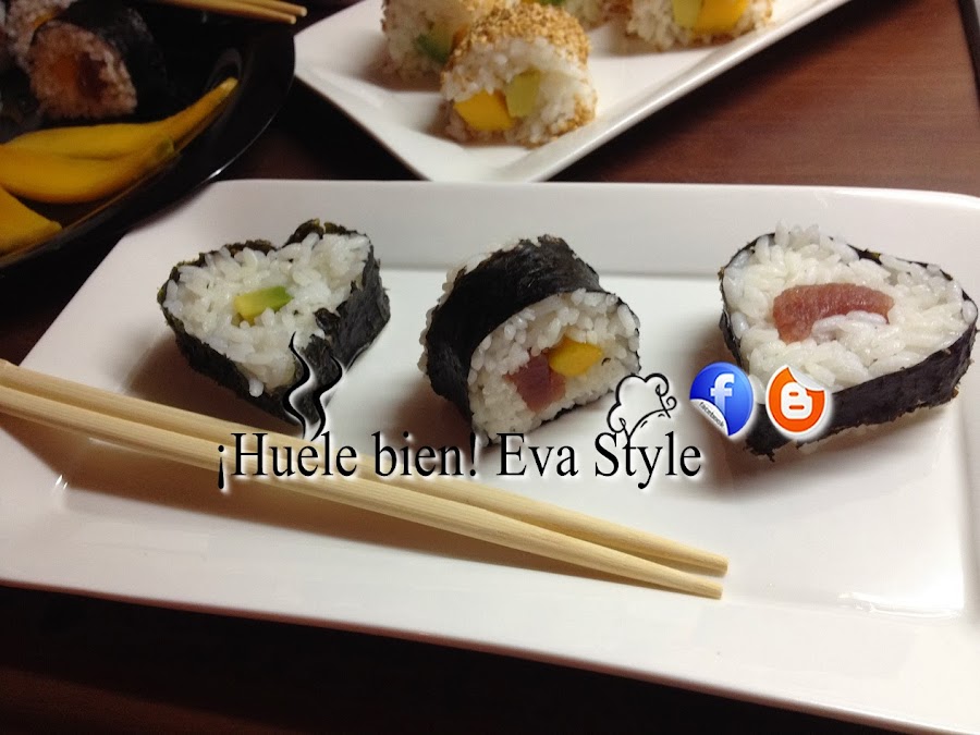 Otra opción es combinar el relleno, poner aguacate y atún, o mango y aguacate... Si no encontramos atún para sushi, también lo puedes elaborar con salmón para sushi, o palitos de surimi.
