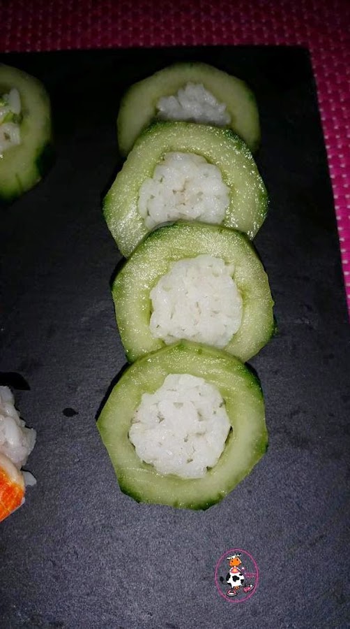 Pelamos el pepino lo cortamos por la mitad y lo vaciamos con cuidado con un cuchillo o cuchara.Rellenamos con cuidado con el arroz y le podemos añadir aguacate en trocitos y surimi. con un cuchillo bien afilado cortamos el pepino en rodajas y colocamos en un plato .