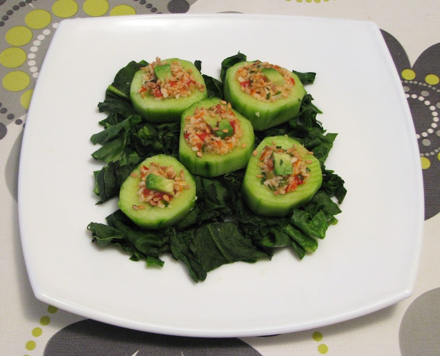 - Corta las espinacas en tiras y colócalas en la base del plato. Pon los rollitos de pepino encima y espolvorea semillas de sésamo por encima.