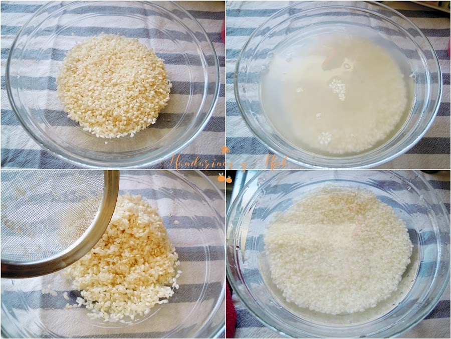 Pon el arroz en un recipiente grande y enjuágalo bien con agua fría, lavándolo con los dedos de forma circular.