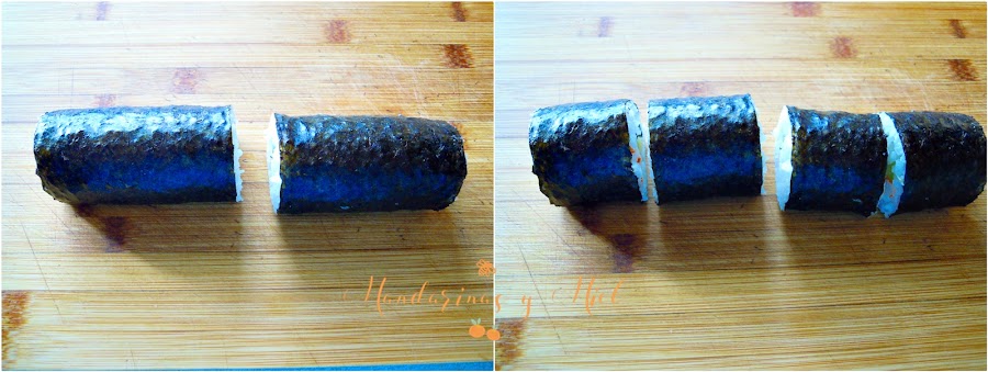 Corta con un cuchillo afilado el sushi por la mitad, luego cada mitad en otras dos, y cada trocito otra vez en dos, te salen 8 makis.