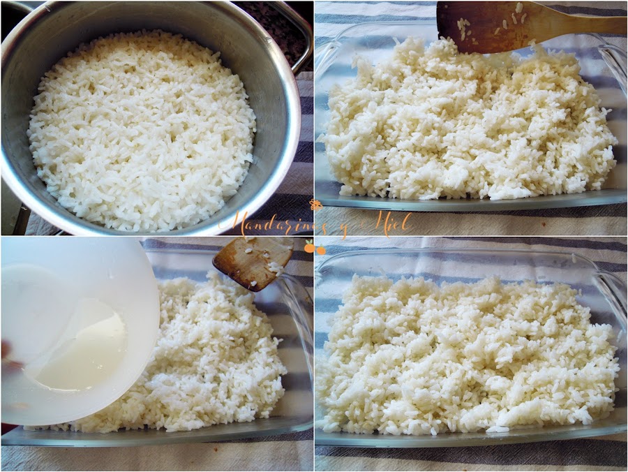 Pasado el tiempo de reposo del arroz, colócalo en una fuente amplia para que se airee. La fuente tiene que ser de cristal, madera o plástico pero no de metal, .