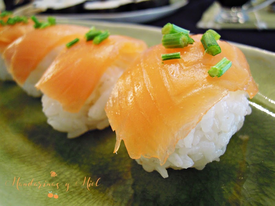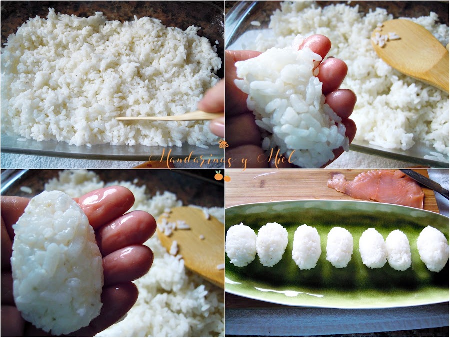 Ahora vamos con los nigiri:Los nigiri son como unas pequeñas croquetas de arroz sobre las que se pone el pescado, en este caso salmón ahumado.