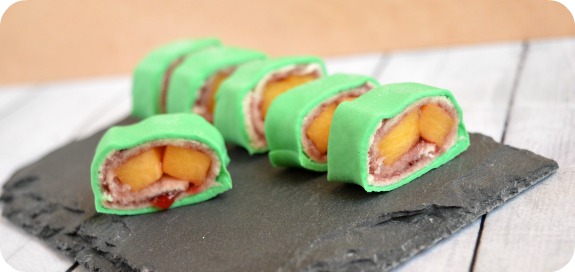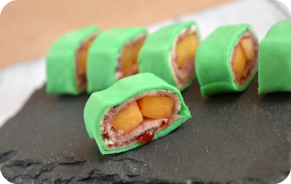 Es una capa de fondant verde que hace las veces de alga nori, una capa de bizcocho aplastada con el rodillo para que quedase finita, untada con mermelada de frutos rojos y con trozos de melocotón. Como ves es como las tartas normales de fondant pero con otra forma. De sabor muy buena, con el dulce del fondant y el bizcocho, el ácido de la mermelada de frutos rojo y el crunch del melocotón... una delicia!!! Al final la cosa salio bien.