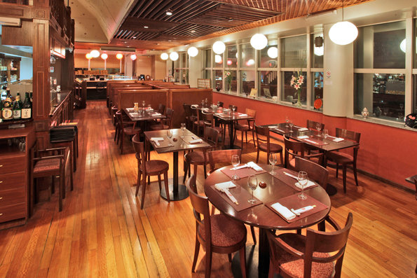 El salón se divide en dos sectores, uno con mesas y otro con boxes, con enormes ventanales con vista a la ciudad que de noche son una deleite de luces.