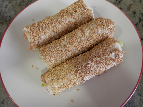 En una bandeja, pondremos las semillas de sésamo y pasamos los rollos por encima para que se le peguen las semillas.