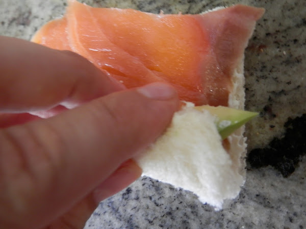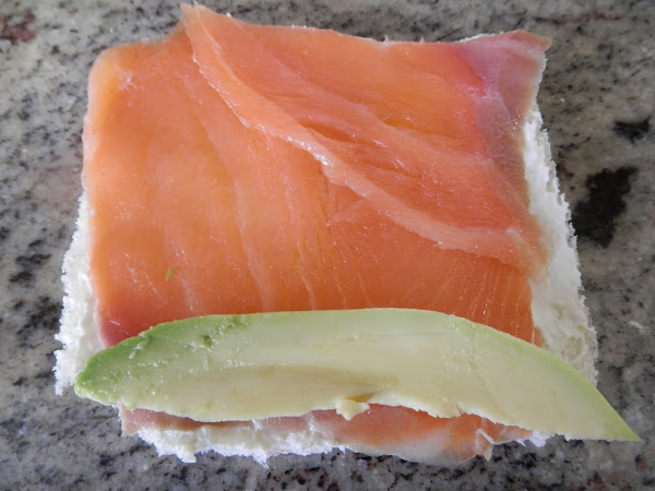 Cortamos el aguacate en tiras y pondremos una tira en la parte más cercana a nosotros encima del salmón, intentad que la tira cubra todo el largo del pan, si no lo cubre añadid otra tira más de aguacate.