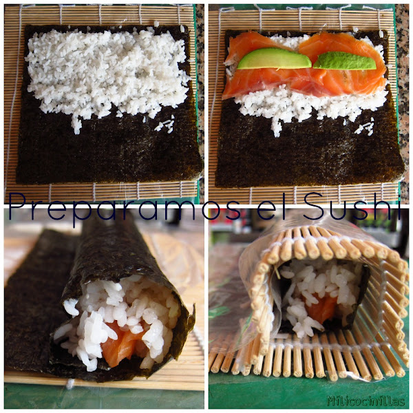 Giramos completamente en la foto 3 veis como he dejado un poco de alga sin doblar...es porque ahí untamos con un poco de agua y damos el ultimo giro. ahora si colocamos la esterilla de bambú y presionamos para cerrar ¡A la nevera! Ufss que estrés de explicación.....¿¿No ha sido tan difícil verdad??