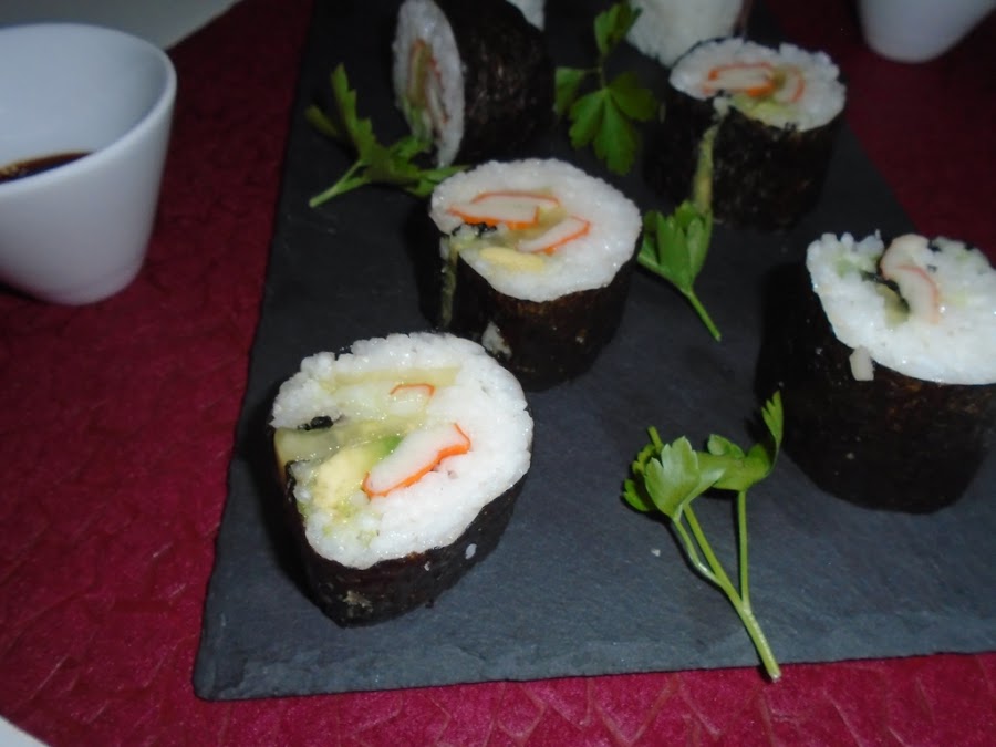 Quiero confesaros que esto del hacer Sushi es más fácil de lo que parece, pero mientras lo intentas, es un verdadero caos, más que nada por que al enrollarlo en la esterilla de bambú, parece que los ingredientes en vez de juntarse como que se separan y es ahí donde empiezas a dar vueltas a la esterilla, con mucho cuidado de que nos quede un cilindro más o menos perfecto, también puede que se nos quede de un lado más grueso que del otro, pero en definitiva una vez que coges la técnica es pan comido.
