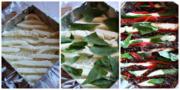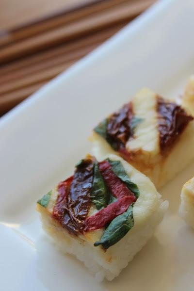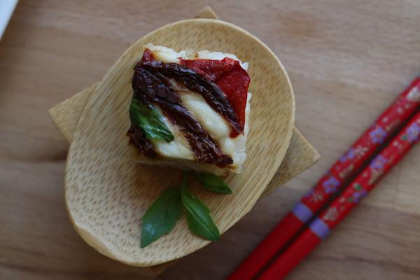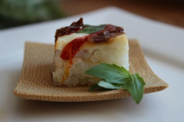 Cortamos el pimiento, el tomate seco y la mozzarella, en tiras finas que distribuiremos con mayor o menor arte, sobre el arroz.