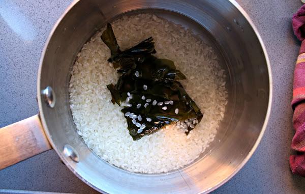 Escurrimos y lo ponemos en una cazuela, junto con el agua y el trozo de alga Kombu.