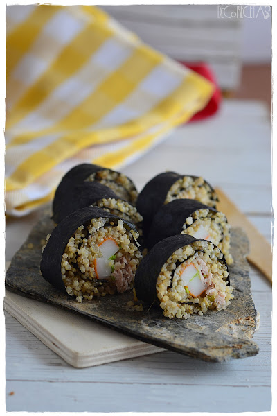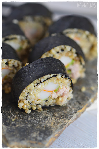 Sinceramente, me resulta más fácil hacerlo con arroz porque la quinoa no queda tan pegajosa, y al hacer los rollitos no se queda pegada y tiende a desparramarse. Es por ello que añadí una tira de mayonesa junto con los ingredientes que puse dentro y parece que mantuvo la consistencia a la hora de cortar los rollitos