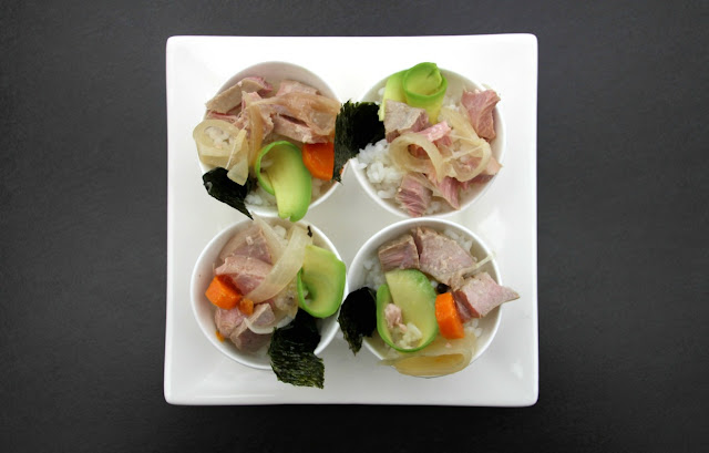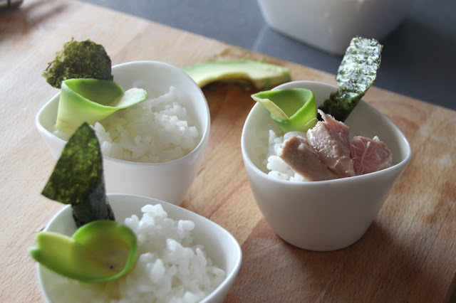 En unas tazas o cuencos pequeños, colocamos dos cucharadas colmadas de arroz. Un poco de alga Nori (hidratada o no).