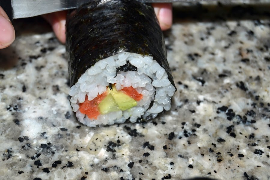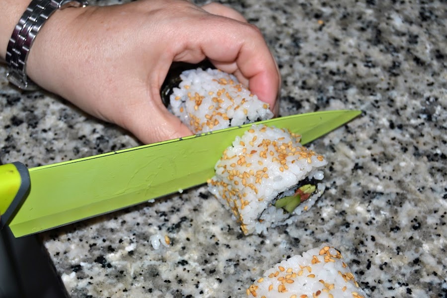 Para un buen corte mojar la hoja del cuchillo en un pequeño bol con agua y un chorro de vinagre de arroz, funciona!!