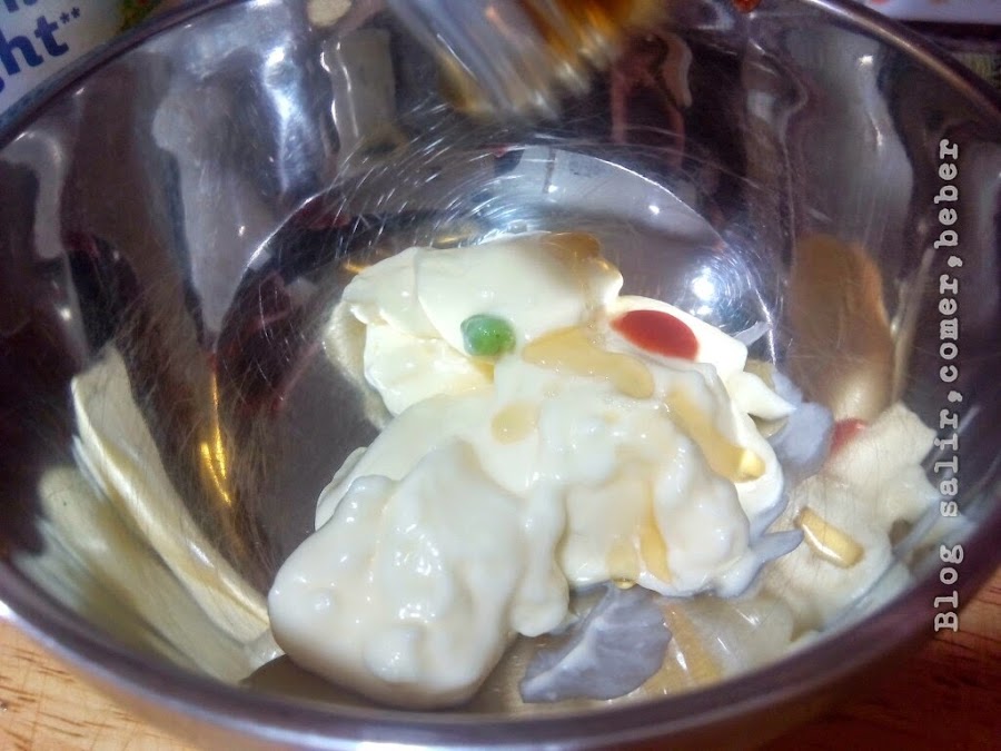 En nuestro caso lo hemos enriquecido con una mayonesa picante, muy sencilla de preparar, cogemos una mayonesa casera o preparada y la aliñamos con un poquito de wasabi, aceite de sésamo y salsa de chili, las cantidades a gusto, probando hasta obtener el picante deseado.