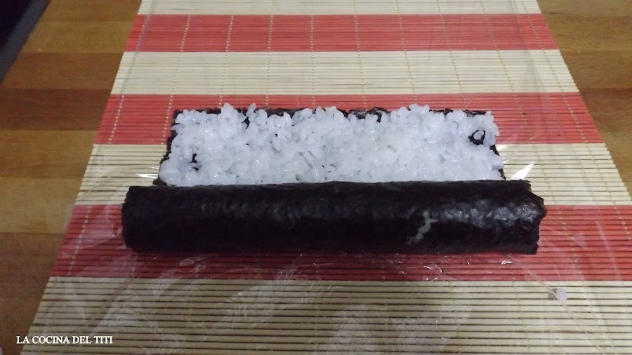 4º Pasamos al Sushi Maki en el que vamos a utilizar una esterilla de bambu y a mi me gusta forrarlo con fil transparente. Pondremos una lamina de alga en el que la parte que mas brilla que quede por fuera. Y si nos fijamos lleva unas lineas el alga en el que colocaremos en direccion al largo de la esterilla.