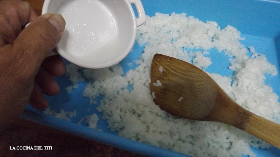Una vez el arroz halla guardado su reposo volcamos en una bandeja y echamos el balsamico de vinagre sobre el arroz mezclando bien