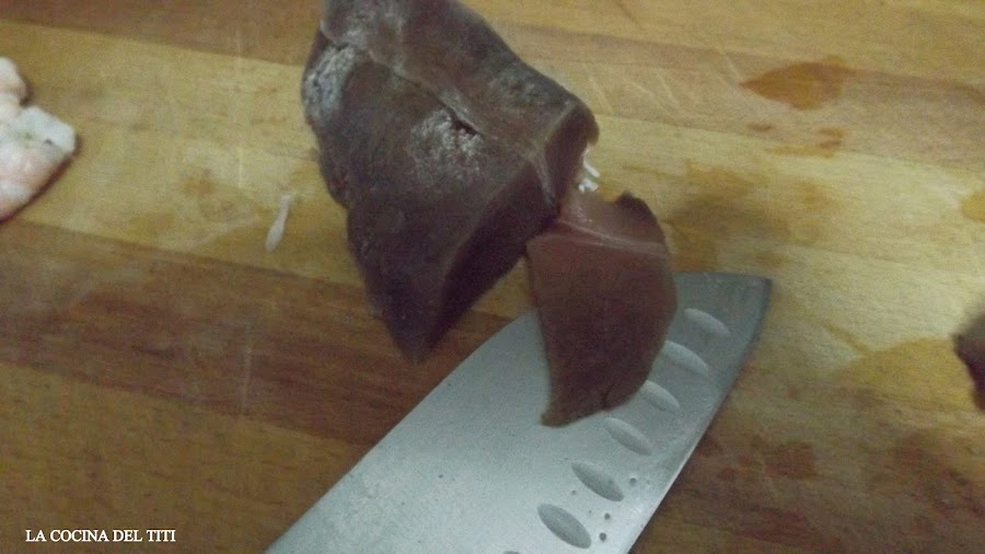 Meteremos el atun en el congelador sin terminar de congelar para que nos sea mas facil sacarle lonchas finas para los Nigiris