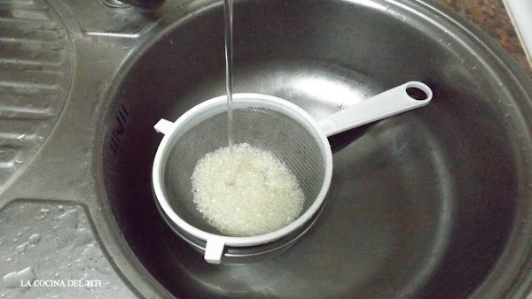 1º Enjuagamos muy bien el arroz con agua fria para quitarle todo el exceso de almidon