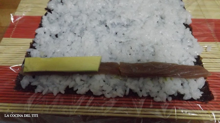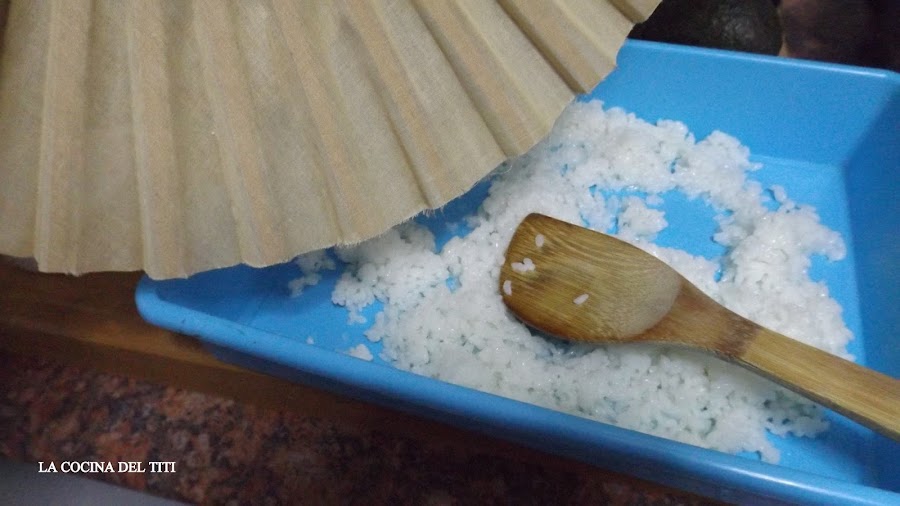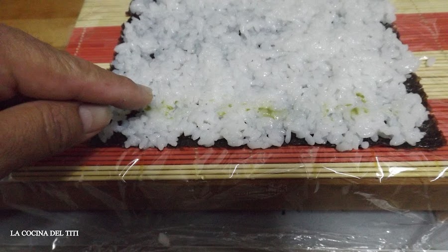 Rellenamos con el arroz y me gusta darle un toque de wasabi como os hedicho en los nigiris