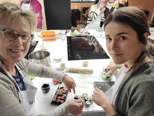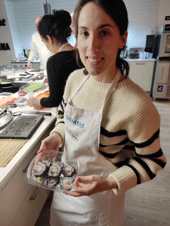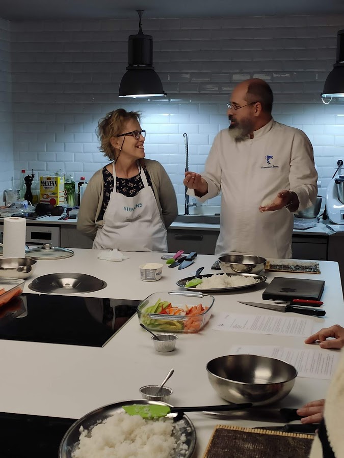 Nos humedecemos las manos y colocamos encima del alga una capa de arroz dejando un par de cm sin cubrir. Ponemos en el centro el relleno, lo podemos rellenar de lo que queramos.